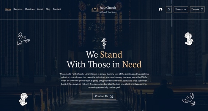 - Pages: Home, Donations, Events, Sermons, Ministries, About, Blog, Contact.