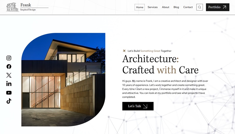 - Pages: Homepage, Portfolio, About, Blog, Contact.