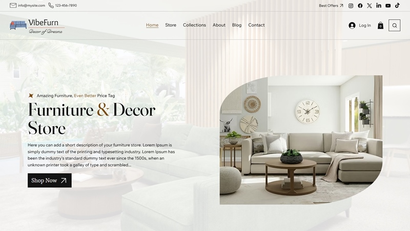 - Seven pages: Home, Shop, Collections, Blog, About, Best Deals, Contact.