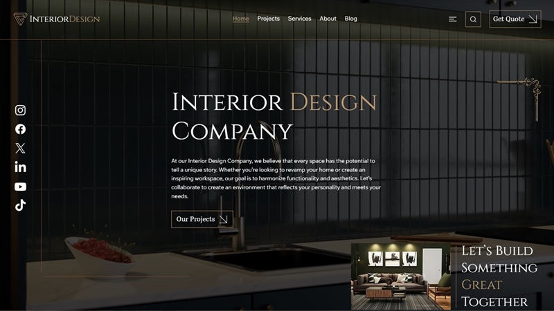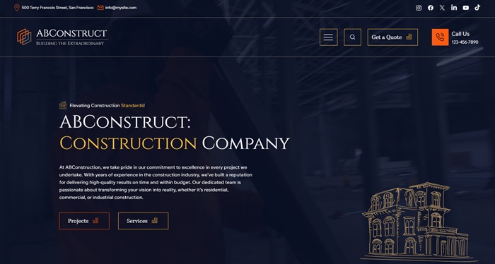 - Pages include Home, Services, Projects, About, Get a Quote, Blog, Contact.
