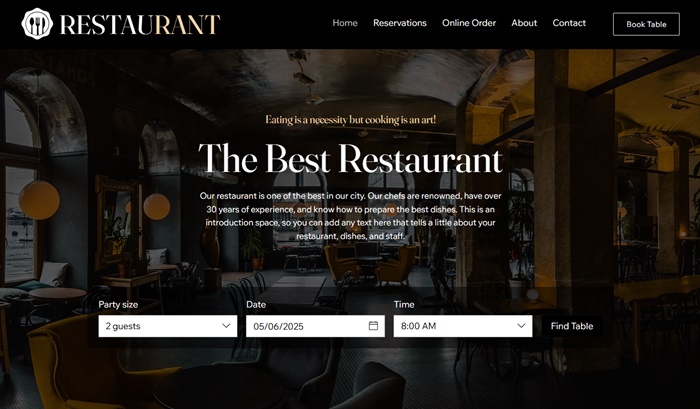 - Includes Contact Us and About pages; supports Wix Table Reservations, search, member areas, and forms.