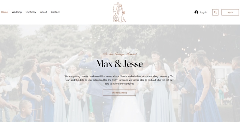 - Pages: Homepage, Wedding details, Our Story, About, Blog, Contact, RSVP.