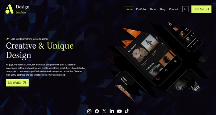 - Dark theme, animated elements, video backgrounds, “Hire Me” form for project inquiries.