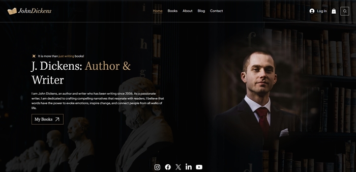 - Five pages: Home, Books/Shop, About, Blog, Contact.