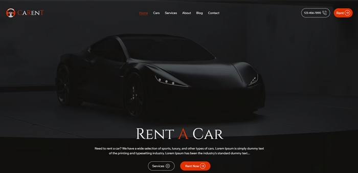 - Pages: Home, Cars, Services, About, Rent a Car, Blog, Contact.