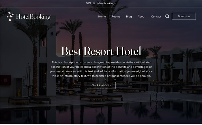 - Integrated Wix Hotels app for streamlined booking, blogging, staff profiles, and search.